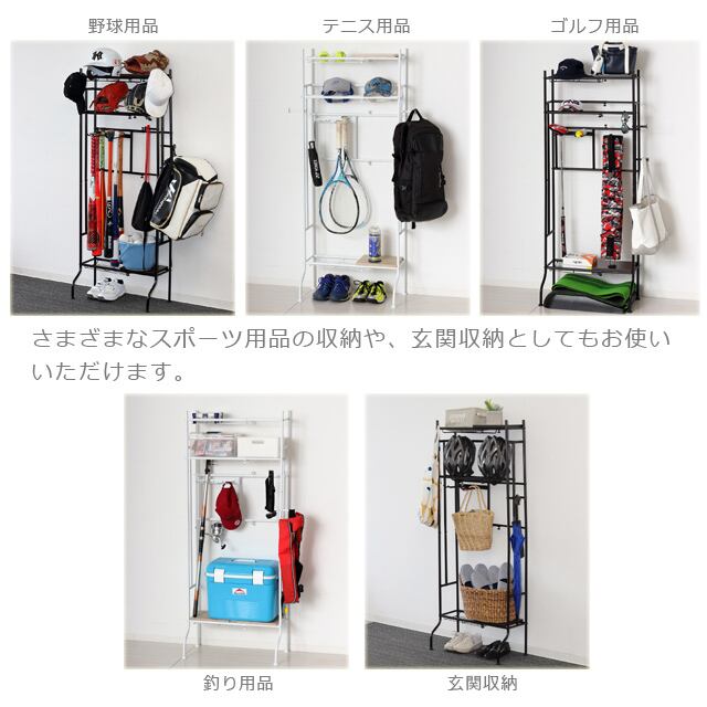 ●さまざまなスポーツ用品の他に、玄関収納としてもお使いいただけます。自転車用ヘルメットやお子様の外遊び道具など、お部屋に持ち込みたくない物の収納に便利です