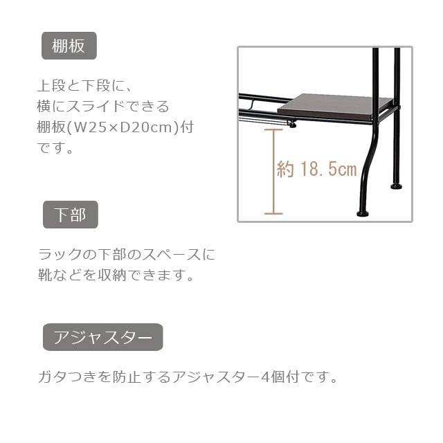 ●上段と下段に、横にスライドできる棚板(W25×D20cm)付です。