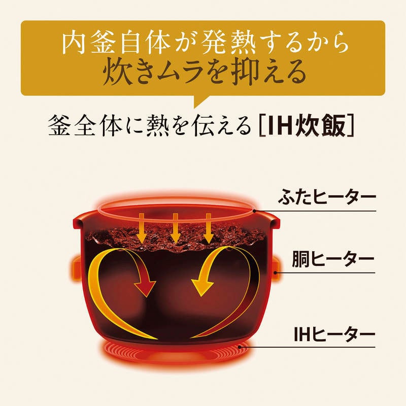 強火で炊き続け、うまみを引き出す「豪熱沸とうIH」。釜全体に熱が伝わる「黒まる厚釜」採用。・炊き方が選べる「白米炊き分け3コース」・おいしく炊ける「無洗米」メニュー・「麦ごはん」「玄米」「雑穀米」メニュー・30時間おいしく保温できる「うるつや保温」。・「高め保温」メニュー・お米のおいしさを引き出す「熟成炊き(白米)」・ニオイが気になる時に便利な「クリーニング」機能・タイマー/2種設定可能・本体に取扱説明書の確認ができる2次元コード付き。