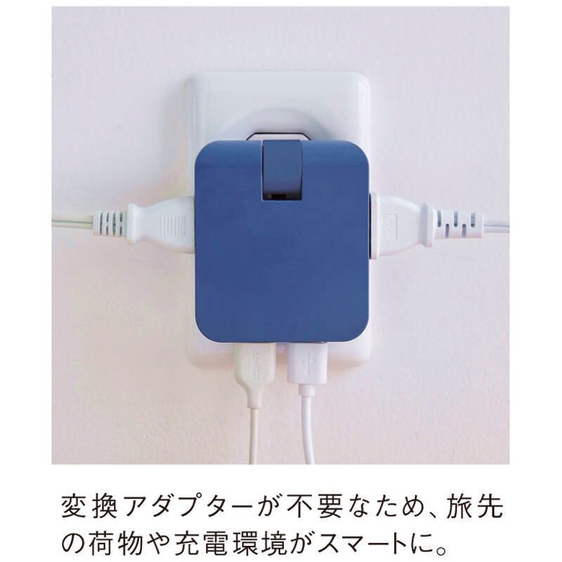 変換アダプターが不要なため、充電環境がスマートに。スリムな形状でプラグ部分は収納可能。USB2ポートとコンセント2口搭載でコンセントとUSBを同時に使用可能。