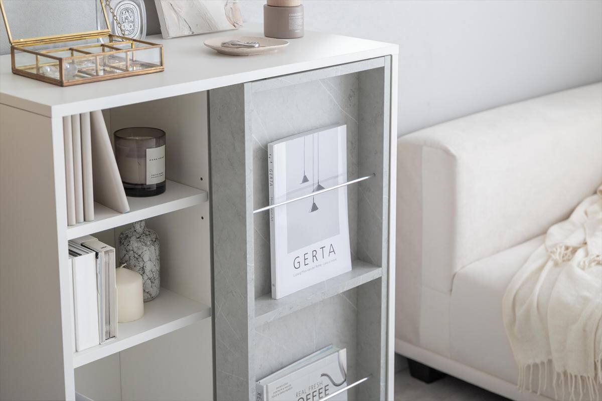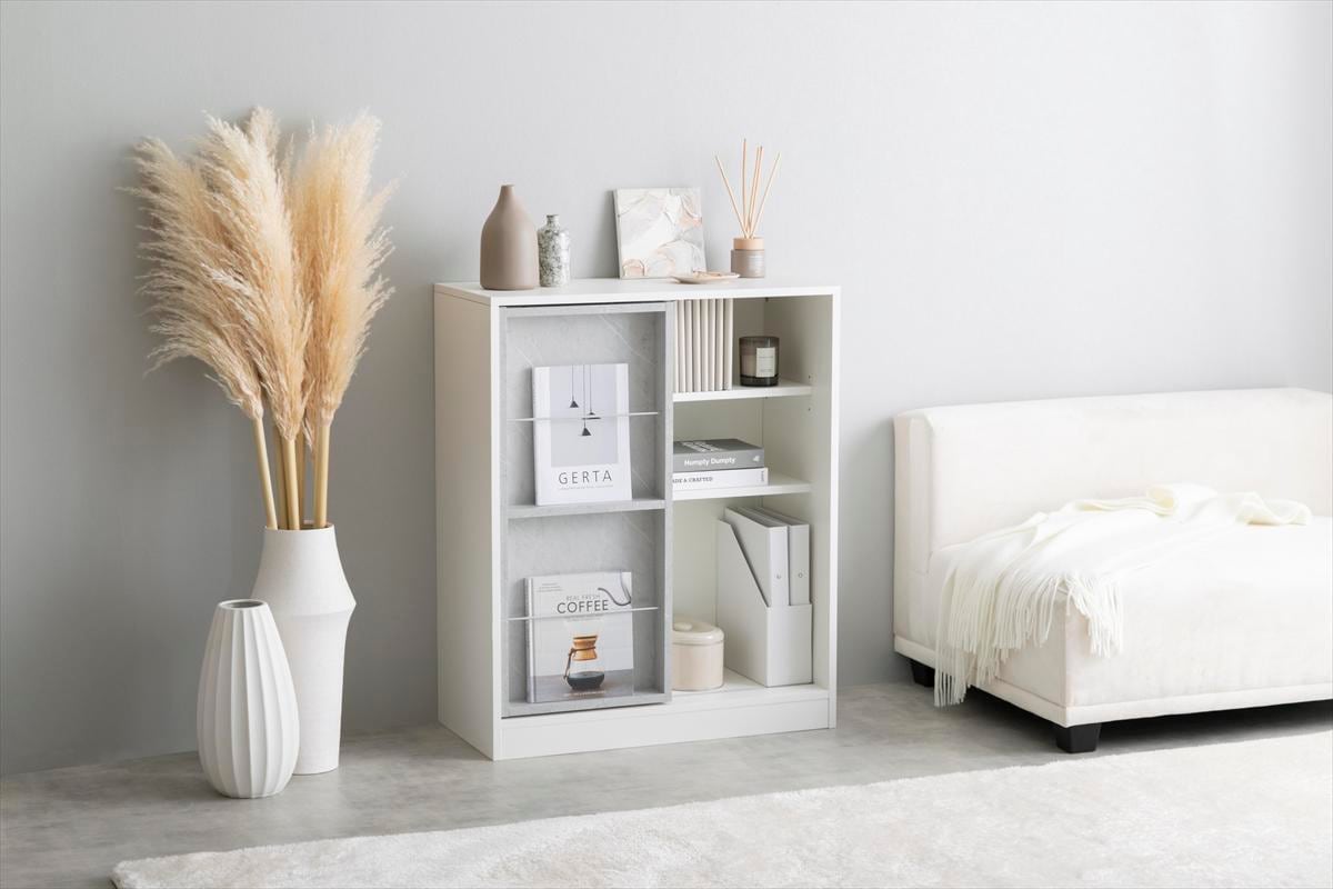 左右に動かすスライド棚で「隠す」と「見せる」が両立できる『Mysa(ミーサ)』スライド収納付き本棚ラック