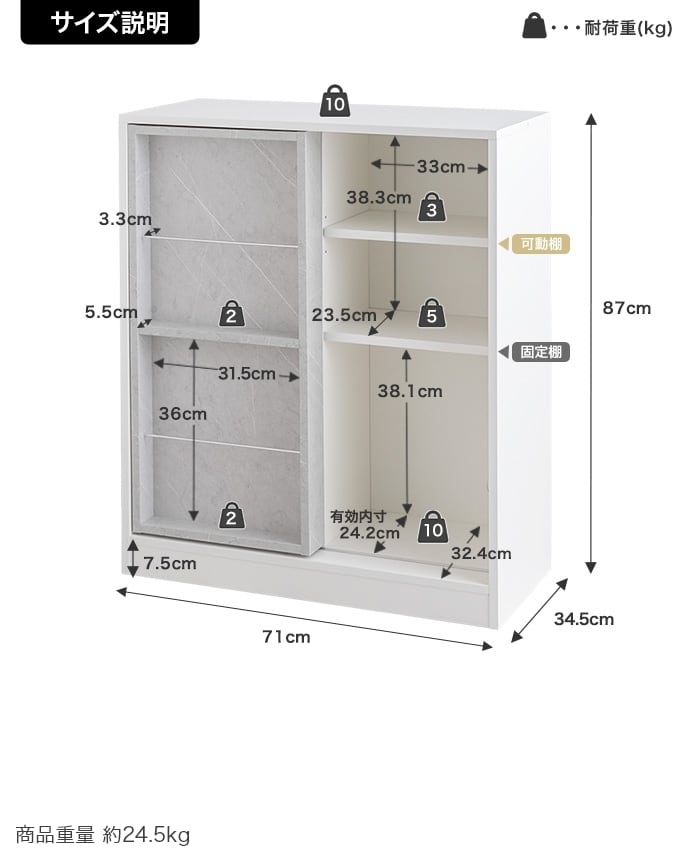 【耐荷重】天板:約10kg 、可動棚:約3kg、固定棚:約5kg、底板:約10kg、スライド収納(各):約2kg