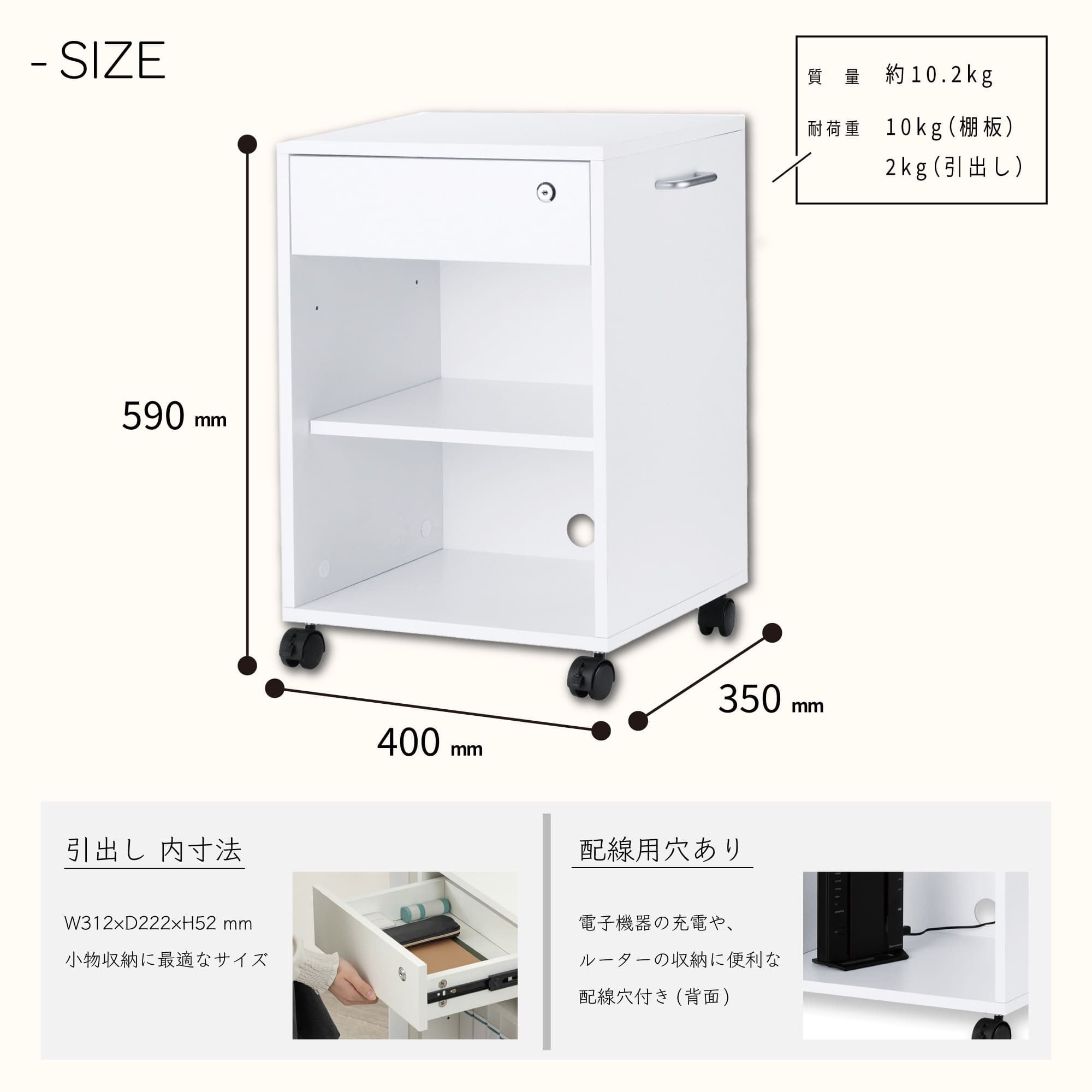 外形寸法:W400mm×D350mm×H590mm(組み合わせ時、突起部含まず)、質量:約10.2kg(組み合わせ時)、【耐荷重】天板/収納部10kg、棚板10kg、引き出し2kg、※こちらの商品はお客様組み立て式です。説明書をよく読んで正しく組み立てて下さい。