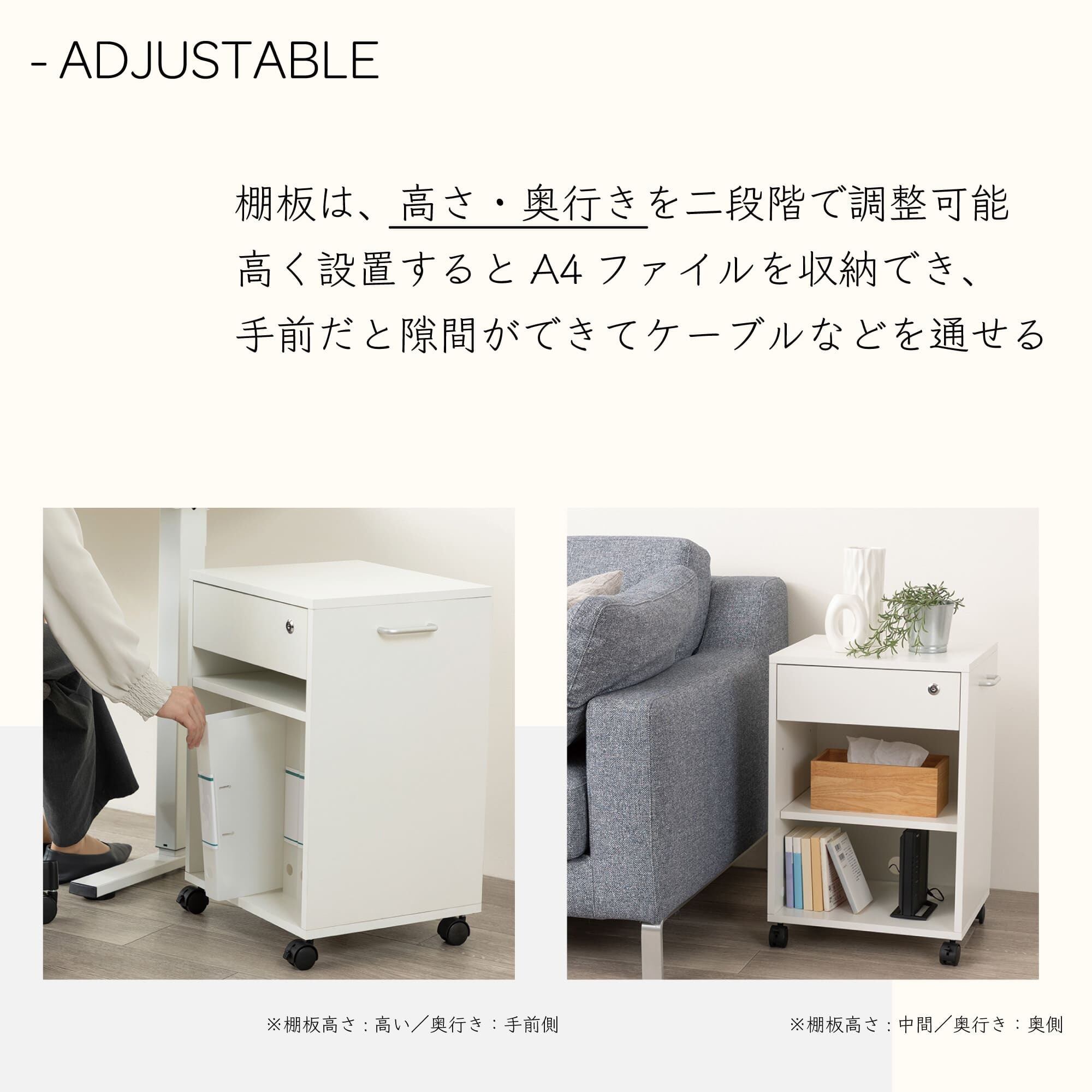 【棚板】2段階に高さ調整可能。板を上に配置するとA4ファイルがたっぷり入る高さに!収納物に合わせてカスタマイズできます。さらに、奥行きも2段階に変えられ、ケーブルを通せる仕様にもできます。
