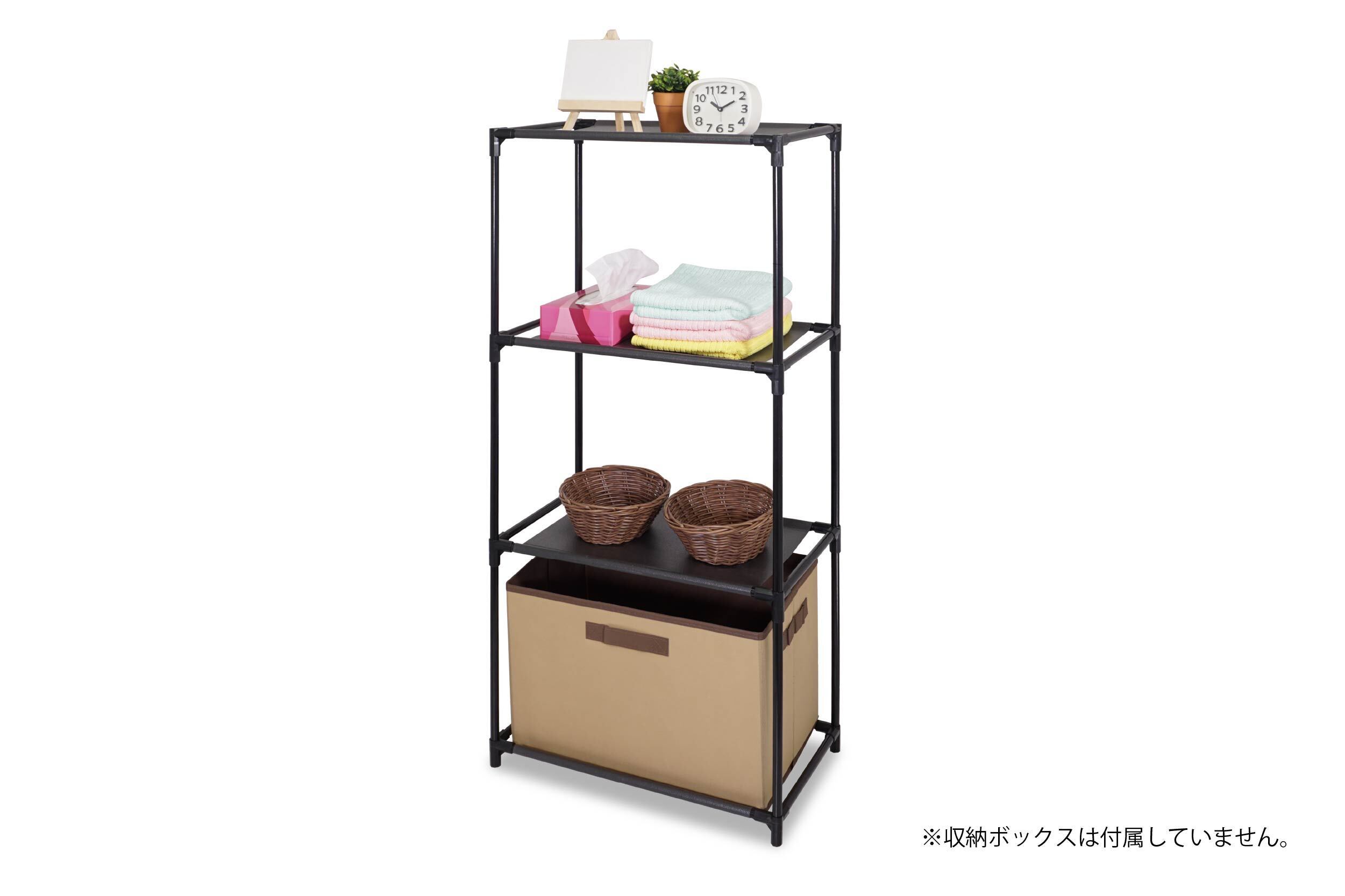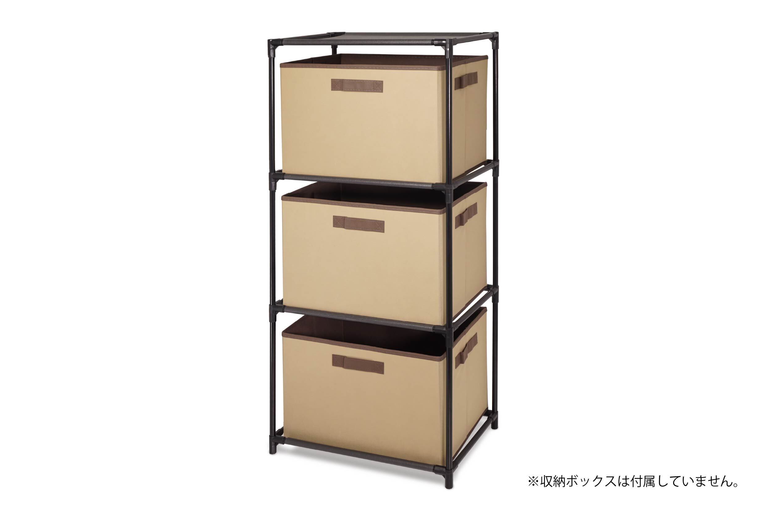 市販されている収納ボックスが収納可能な3段式収納ラック。