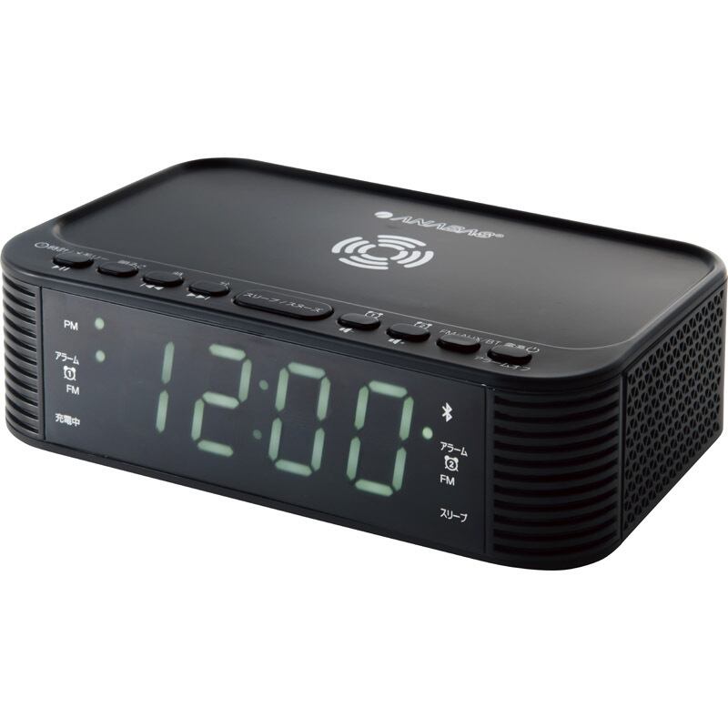 スマホ充電・FMラジオ・Bluetooth機能・目覚まし時計の1台4役!・スマホ(Qi対応機種)を上部に置くだけのワイヤレス充電、背面のUSB出力端子を使用すれば2台同時に充電できます。・Bluetooth機能搭載で、充電しながら音楽が聴けます。・FMラジオ(ワイドFM対応)は、16パターンのプリセットが可能・FMラジオ・ブザーの2パターンが選べるアラーム機能・スリープ・スヌーズ機能装備・外部入力端子・USB出力端子装備