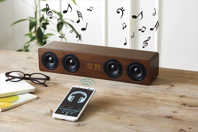 4連のスピーカーから大迫力のサウンドを楽しめるワイヤレススピーカー機能付の時計です。環境に優しいMDFを使用。・アラーム・スヌーズ・カレンダー・TF(microSD)カードスロット・Auxポート
